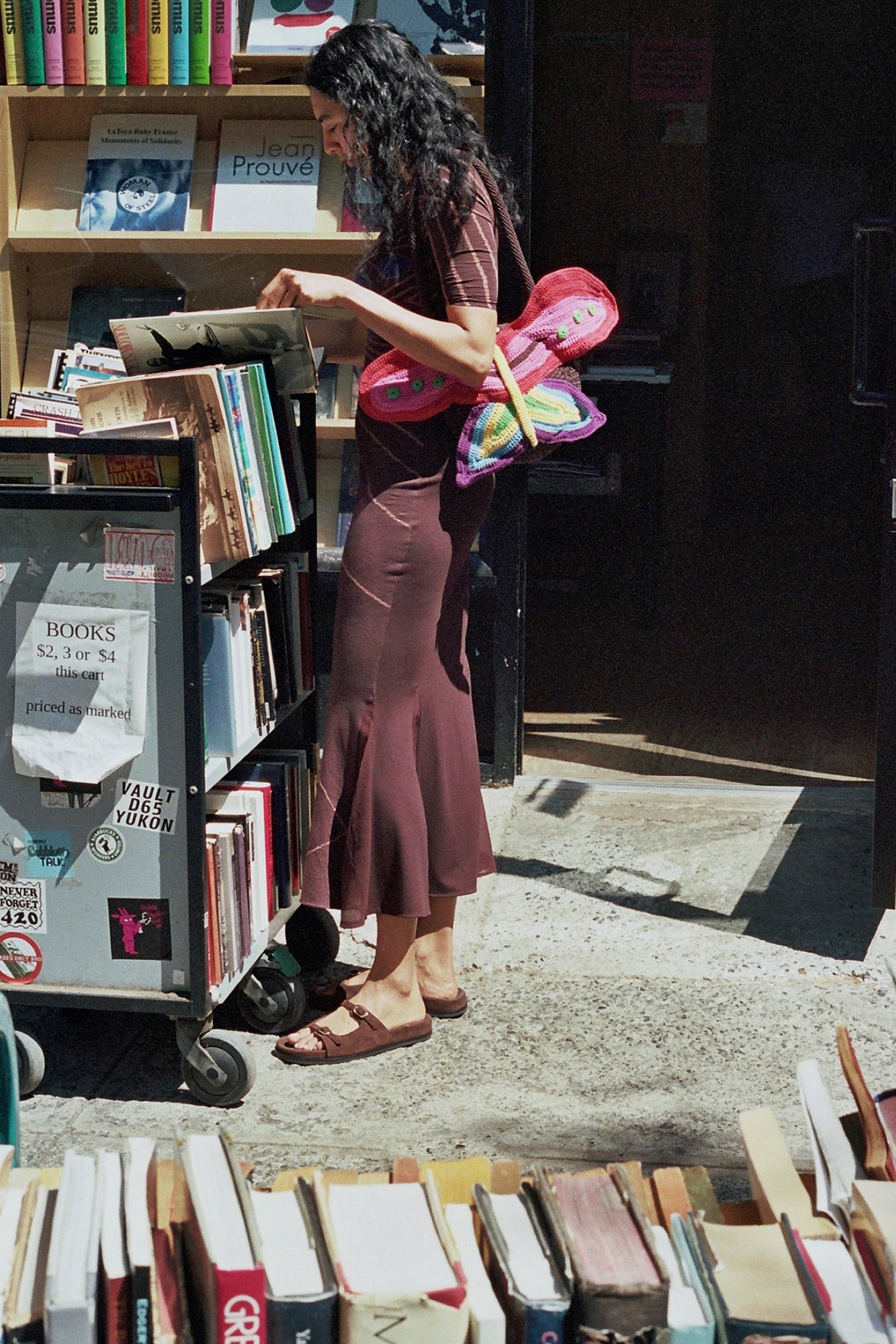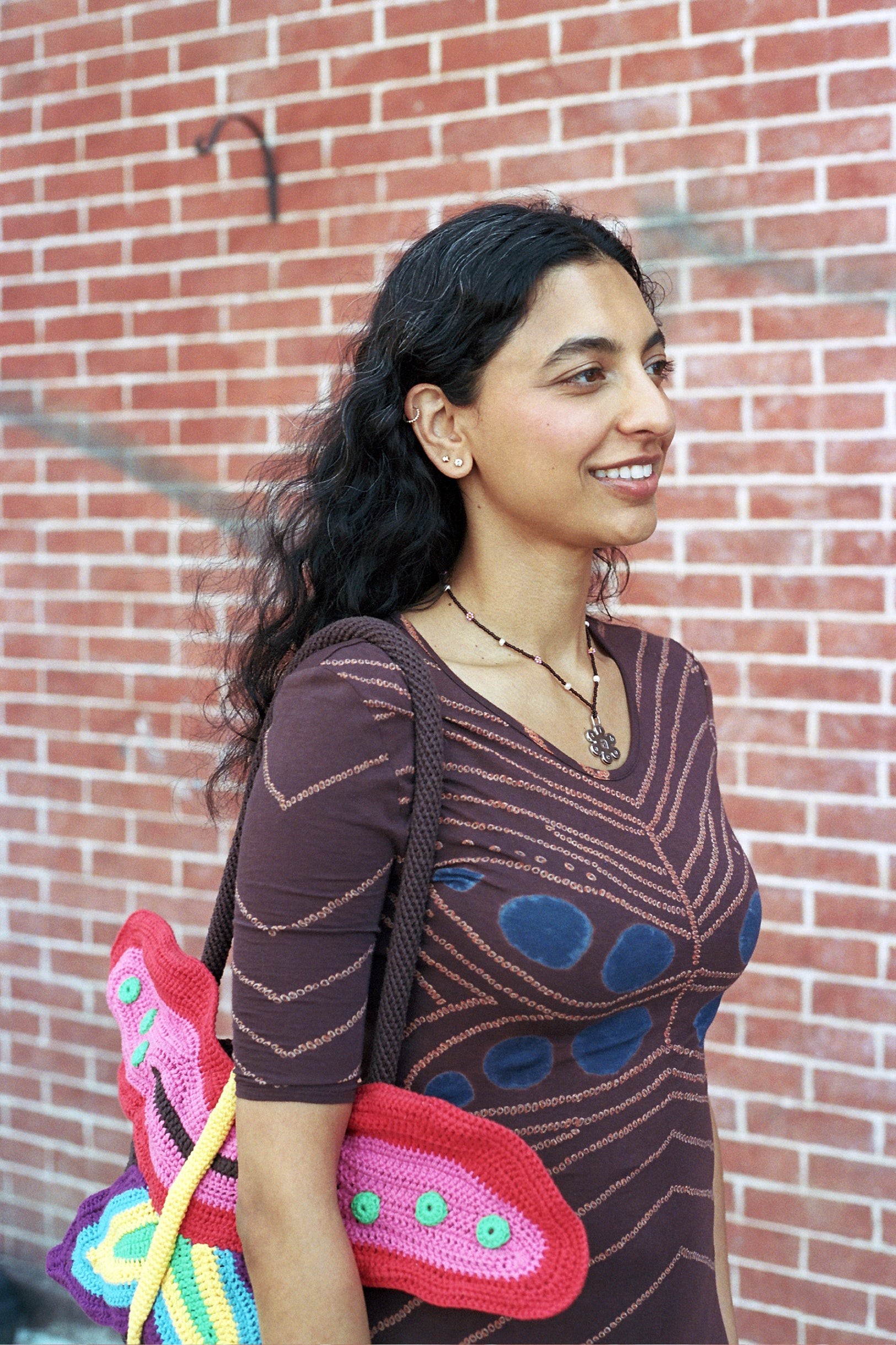 A maxi dress made with soft cotton jersey that has been intricately hand-tied and dyed using the ancient bandhini technique, by master dyer Adilji in Bhuj, India. An abstract butterfly design is featured at the front.
