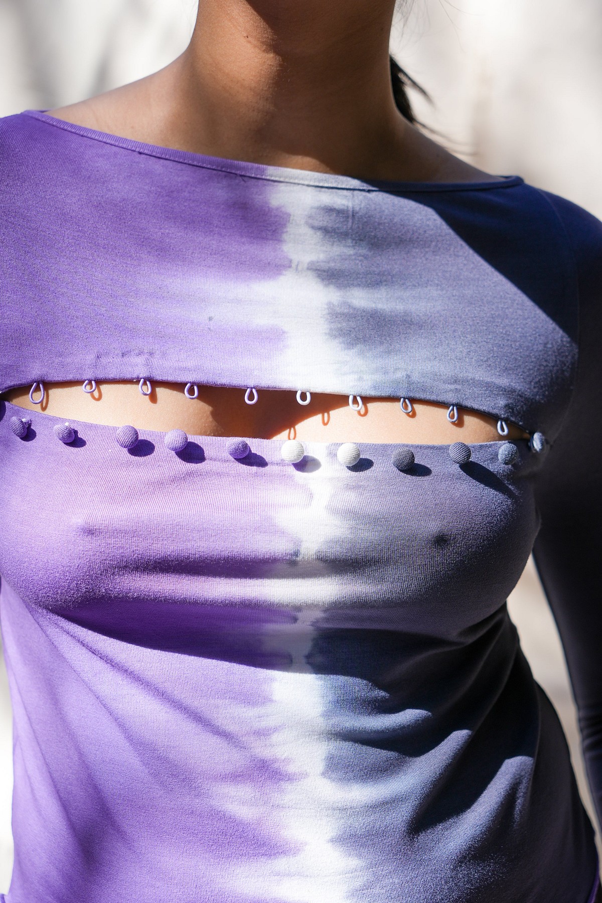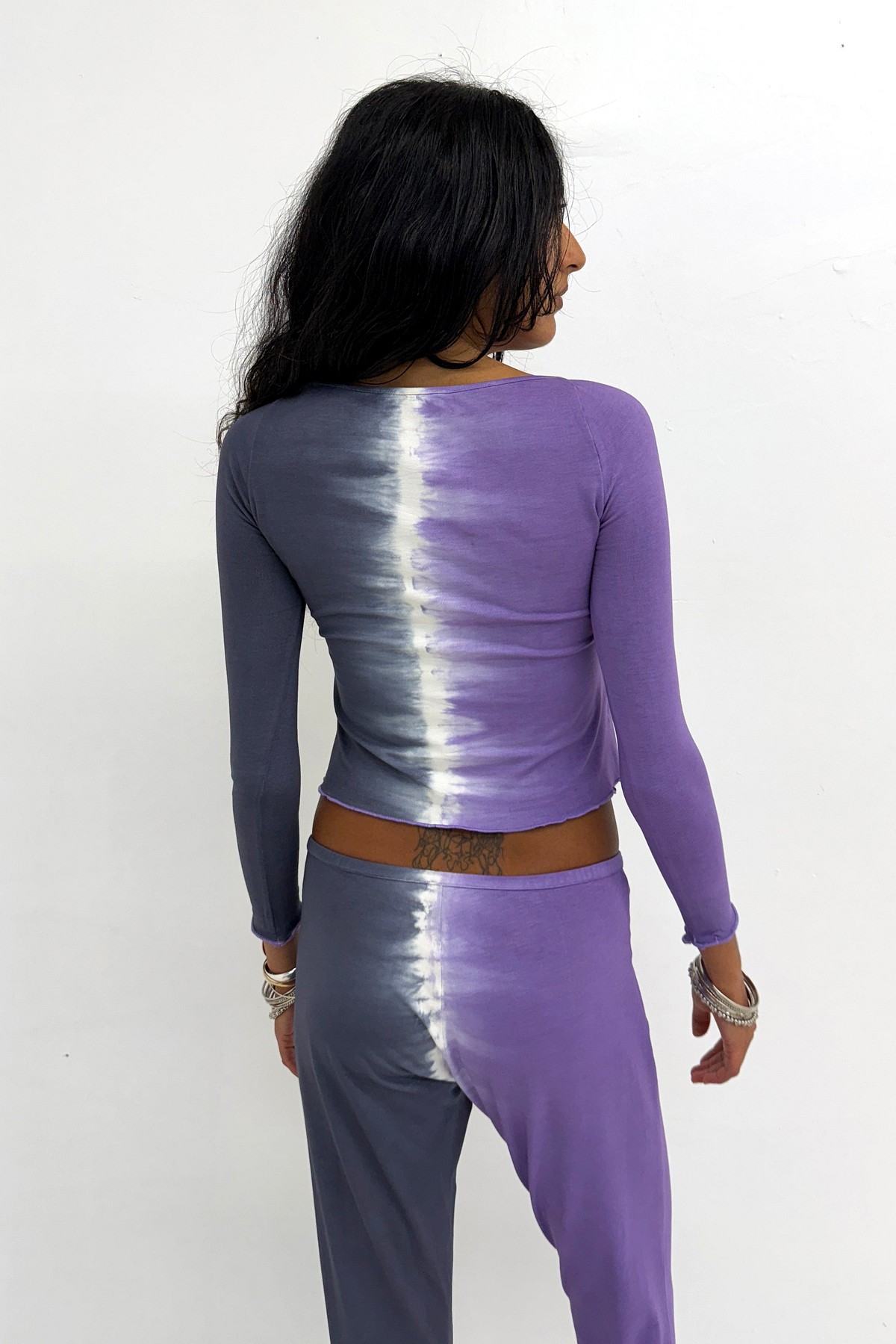 A 90s-inspired essential, this long-sleeve Tee made of soft jersey has self-covered buttons, and a contoured fit. Leave the buttons undone for a subtle peekaboo yoke moment. Tie-dye inspired by a dusk to dawn concept. Each top is garment-dyed by expert artisans by hand in Delhi, India in a limited run.
