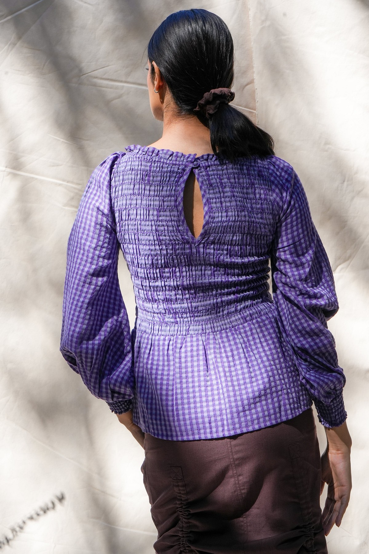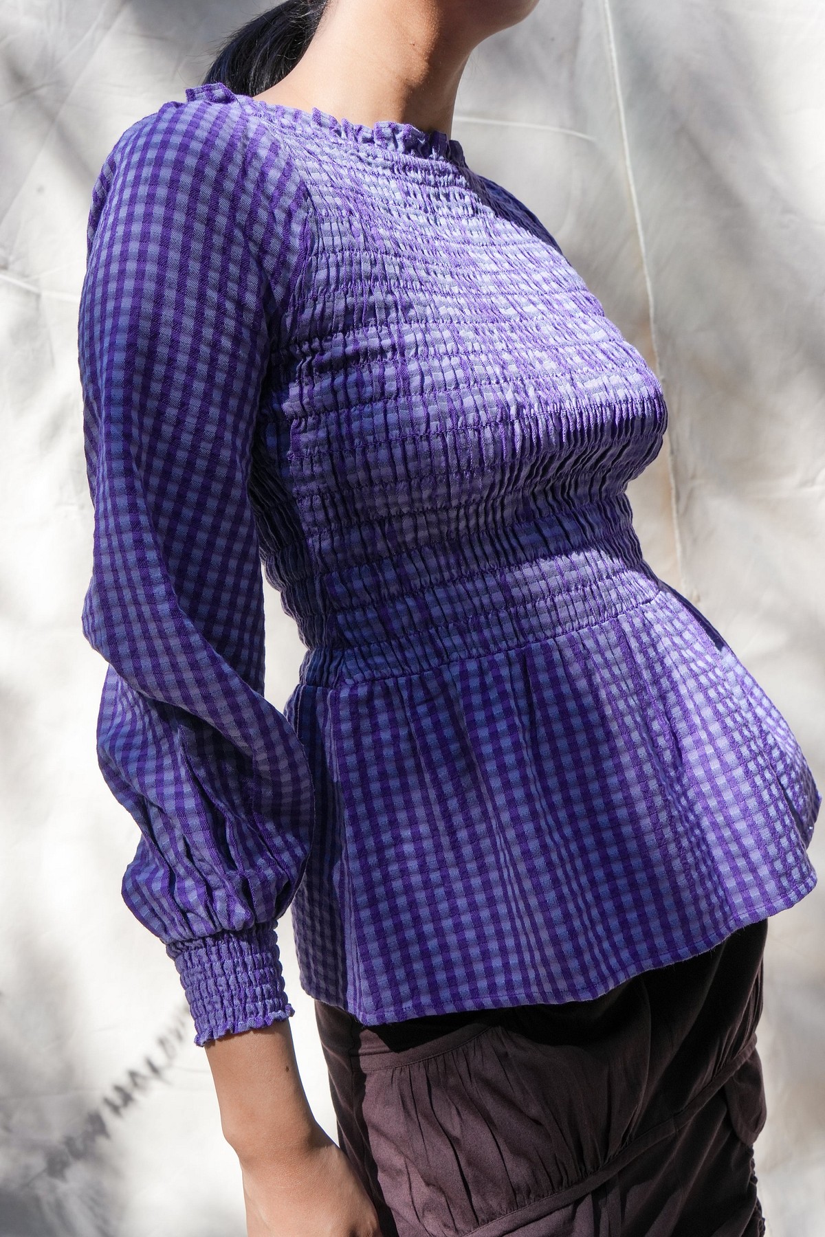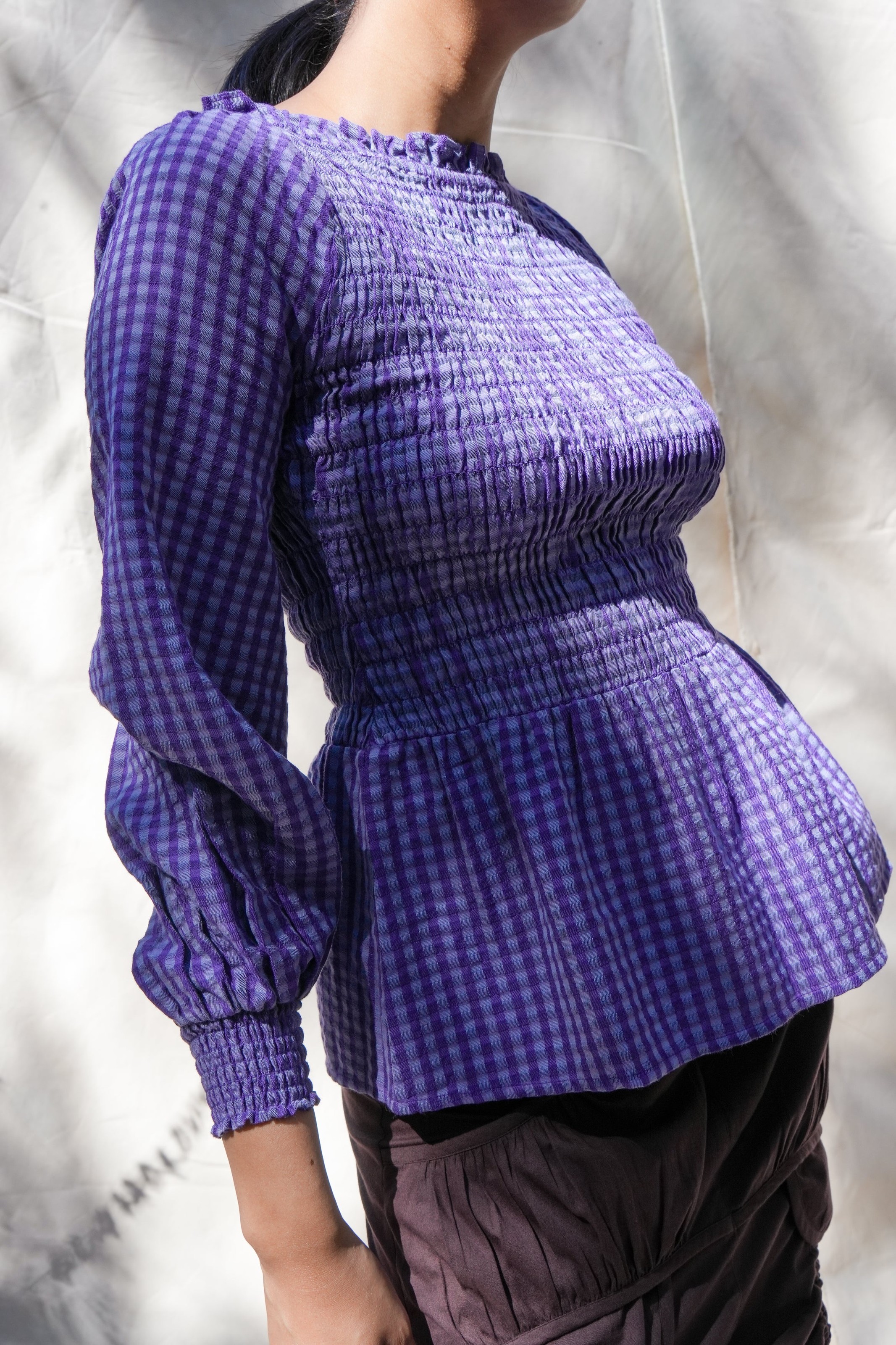 This smocked peplum top comes in our new wool-blend gingham weave, and pairs perfectly with your favorite denim or our Smocked Maxi Skirt for a matching set. Designed to flatter all shapes, sizes, and curves with elasticized smocking and a small ruffled peplum at the waist. Keyhole closure at back.