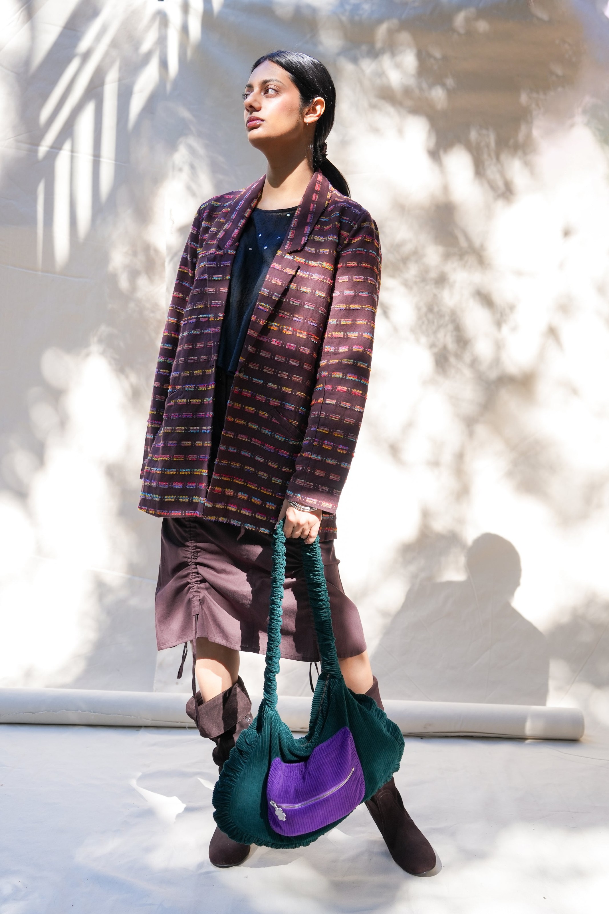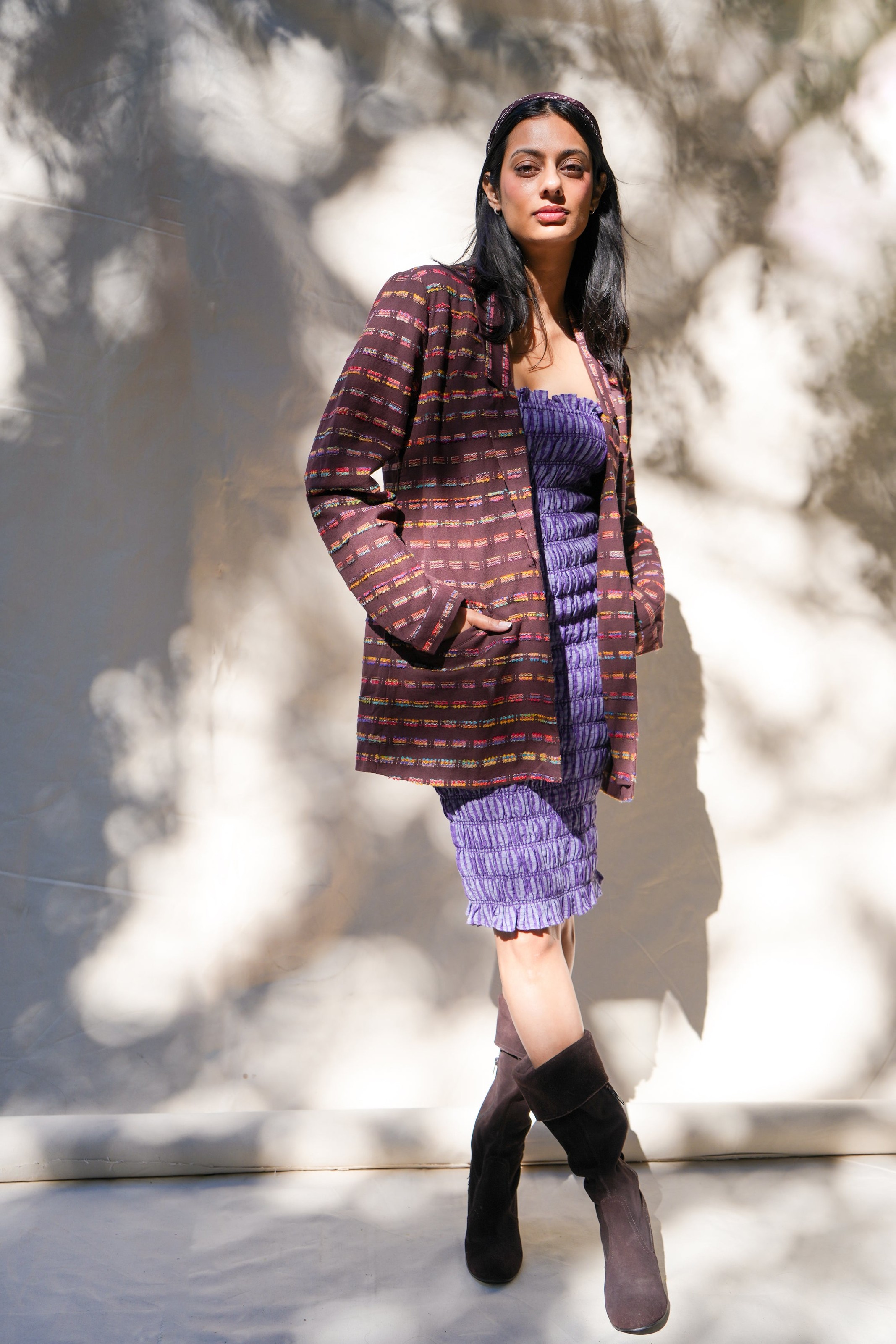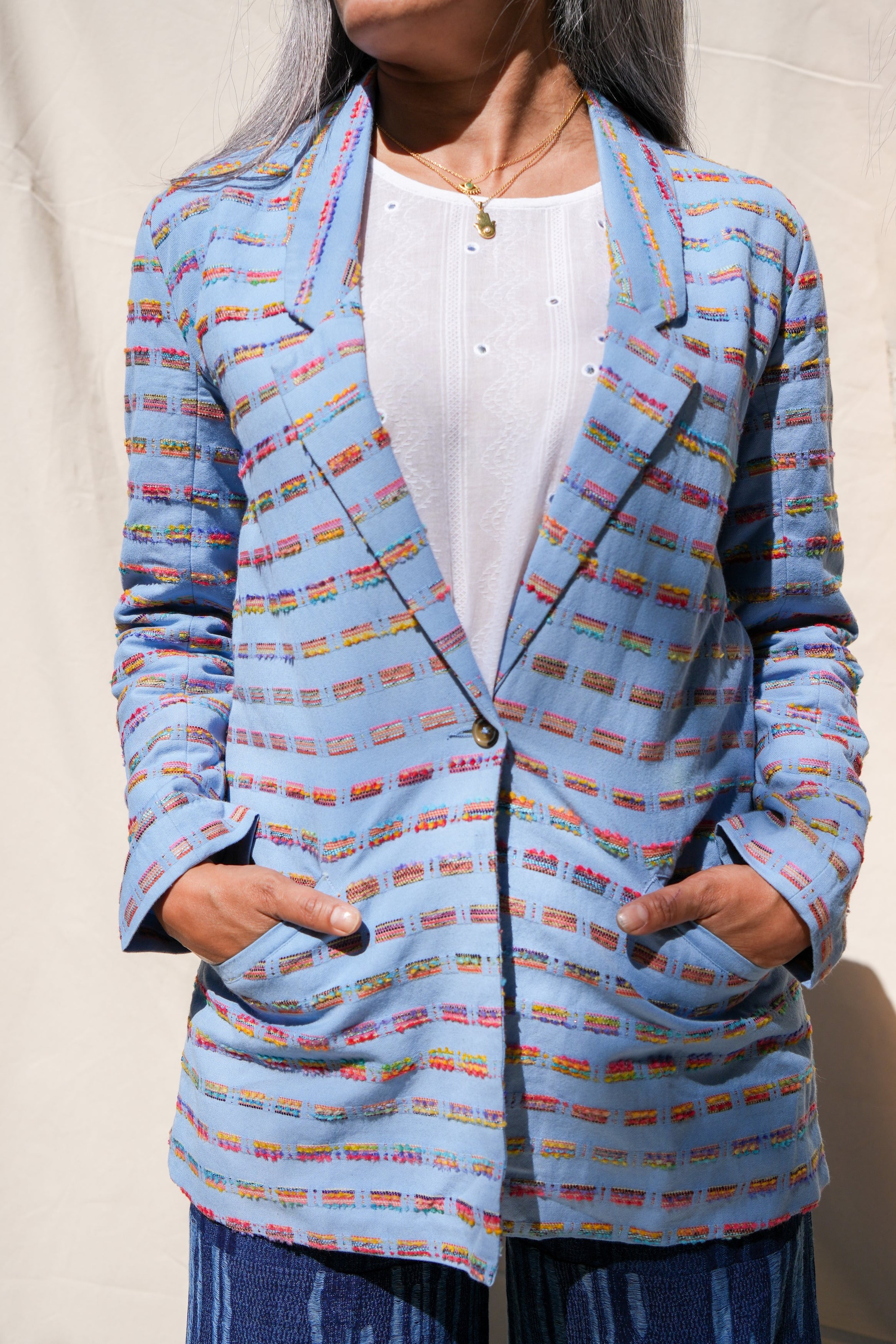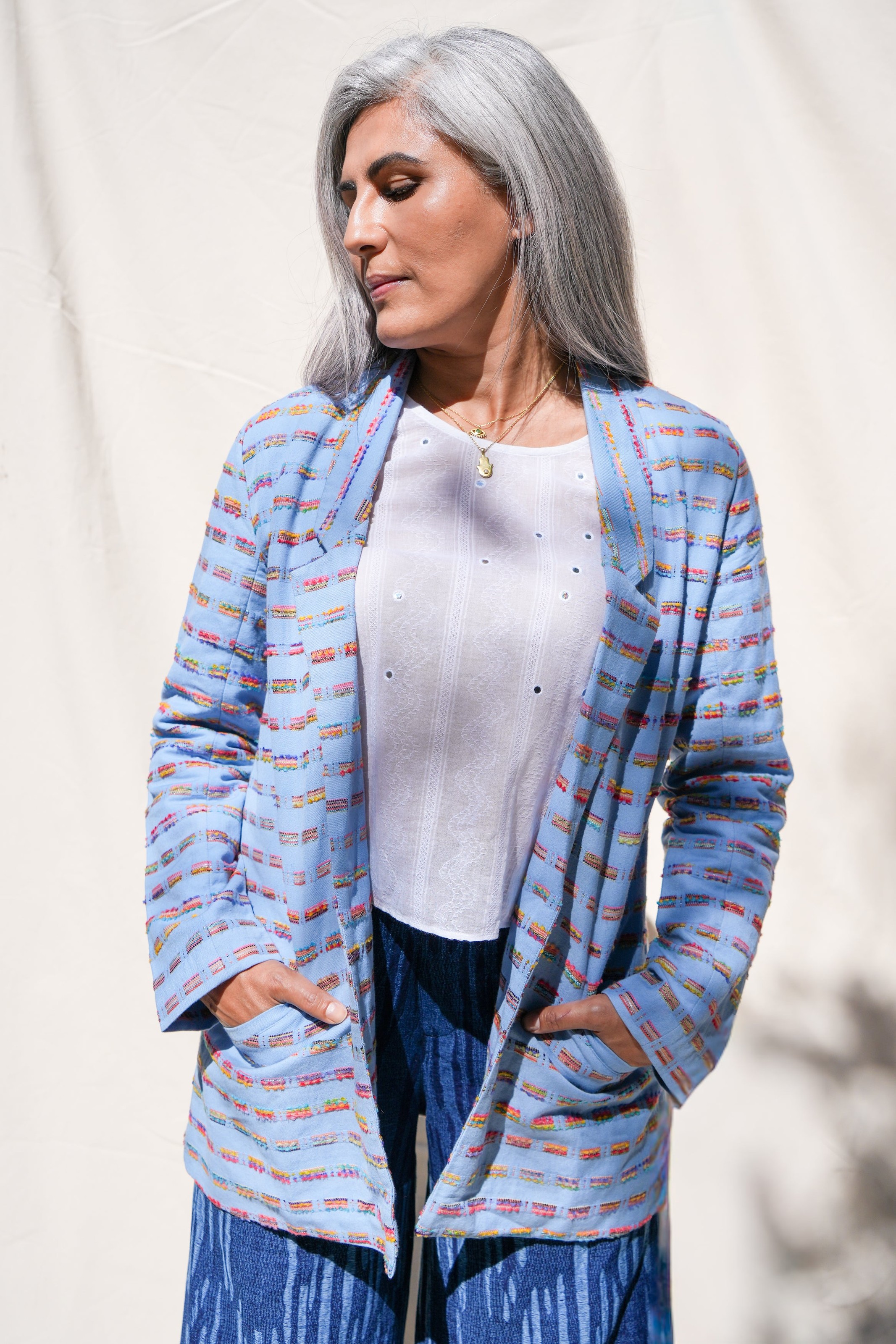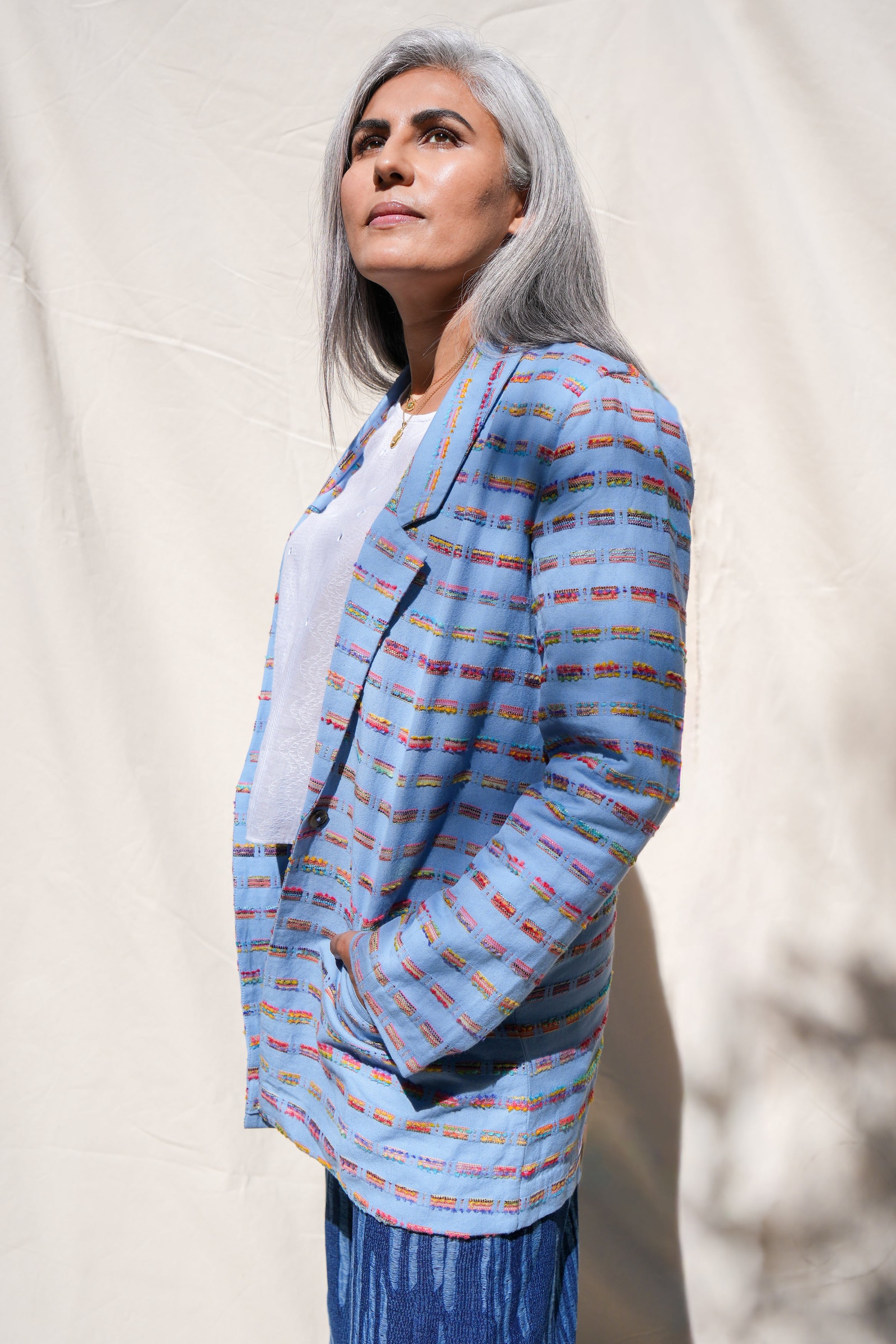 This season’s tailored blazer is crafted in a richly textured cotton jacquard, woven in Punjab with a kaleidoscope of multicolored threads. This Fall jacket elevates denim, pairs with trousers for suiting, or layers over dresses for structured contrast. Available in espresso brown or cashmere blue.