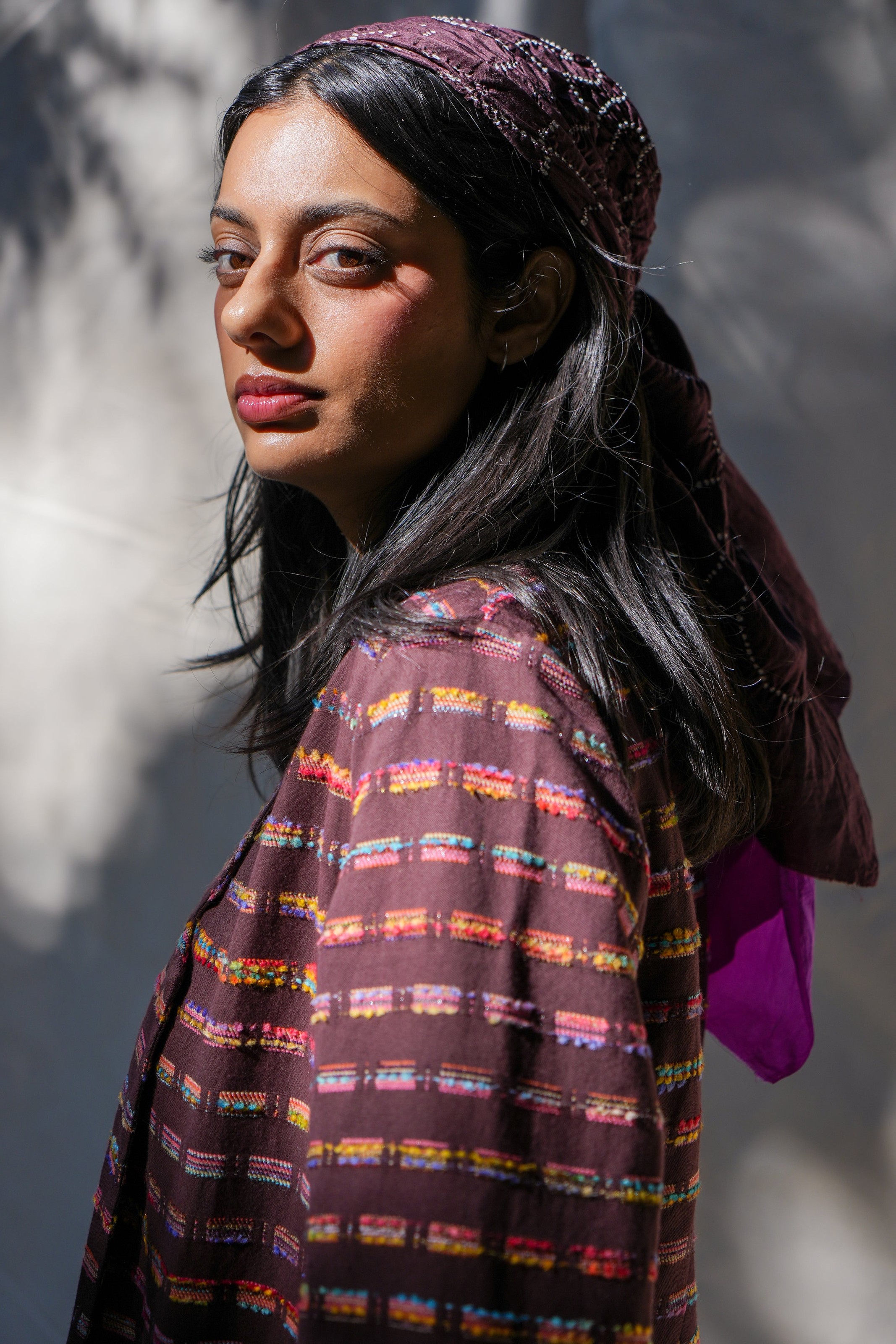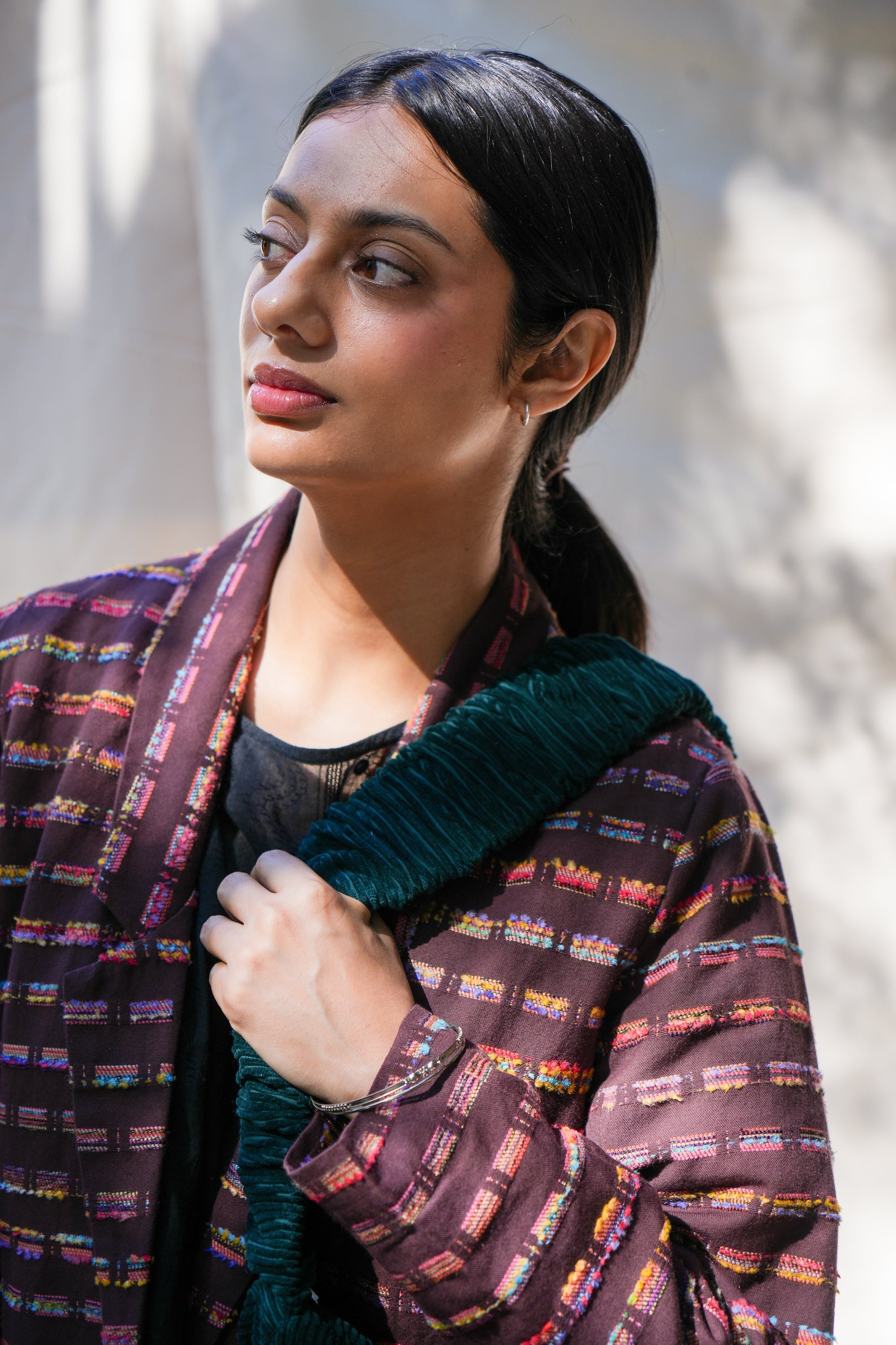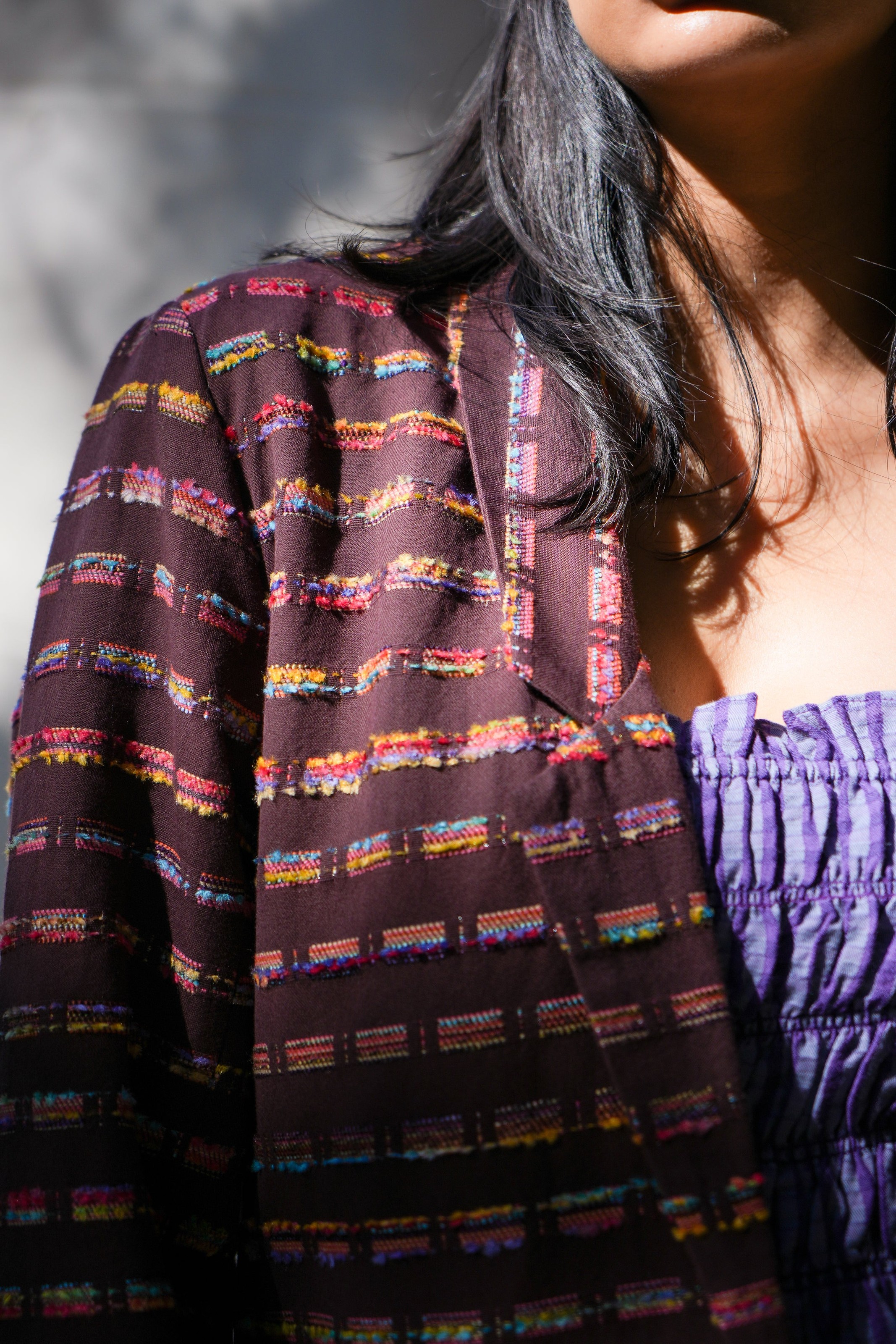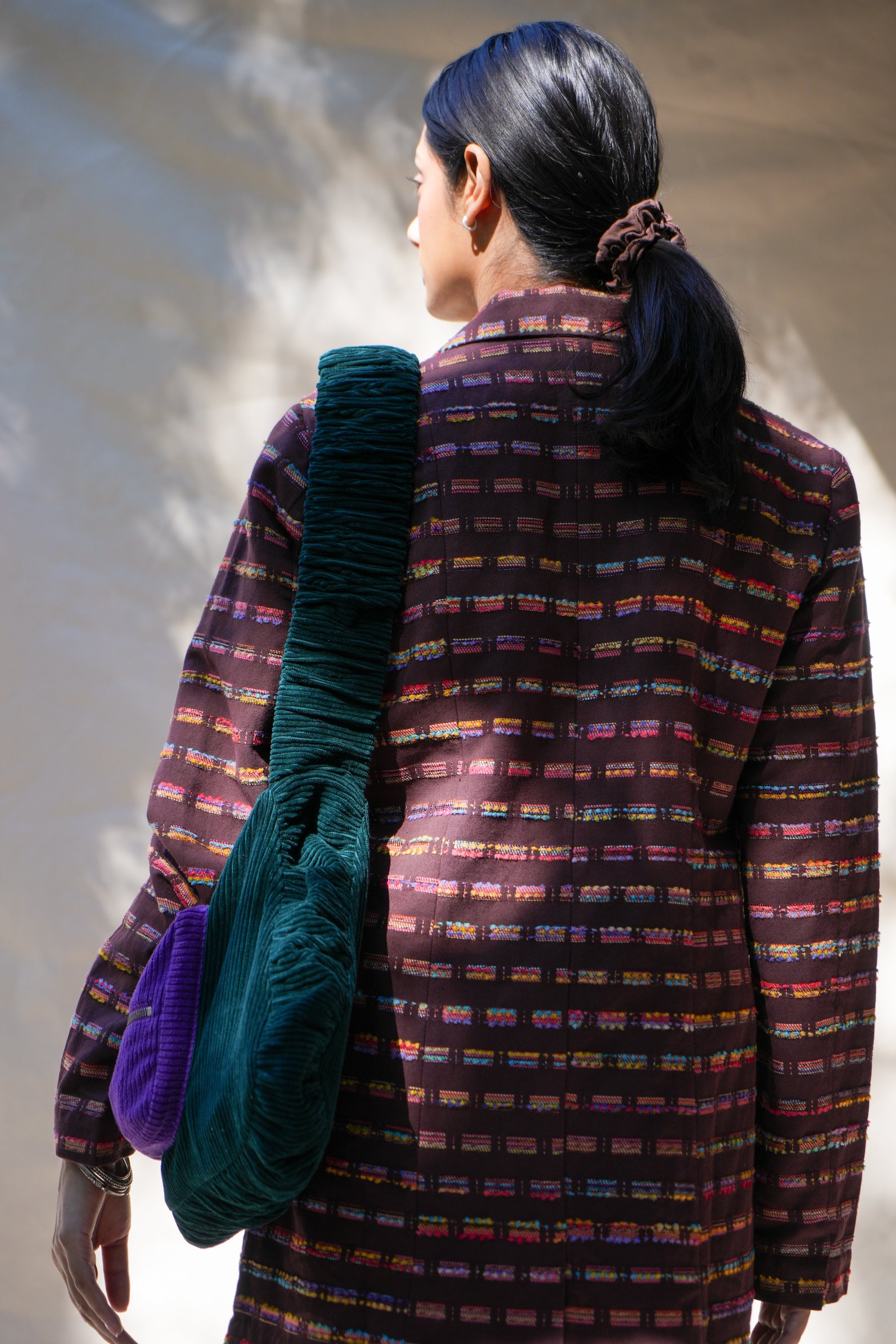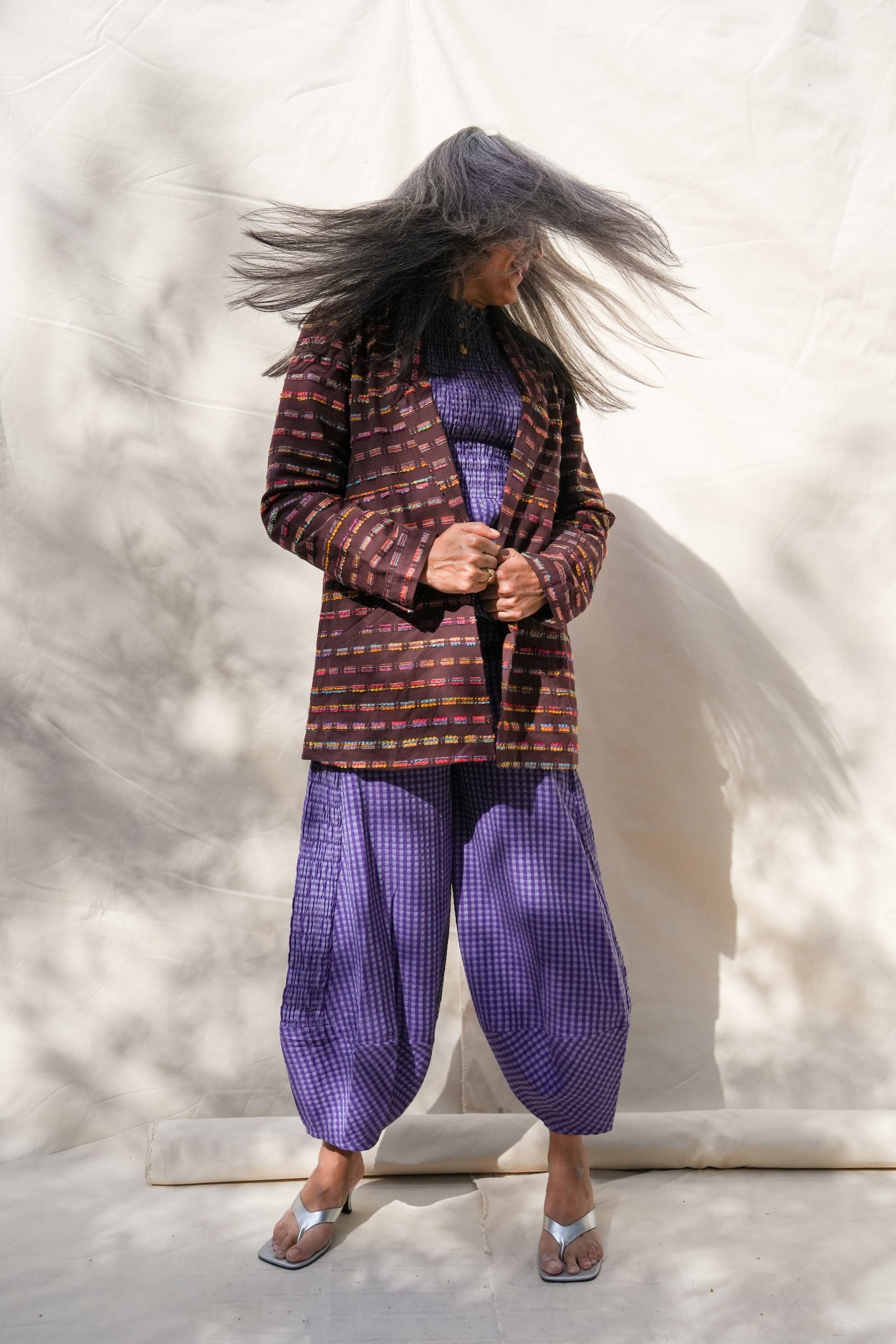 This season’s tailored blazer is crafted in a richly textured cotton jacquard, woven in Punjab with a kaleidoscope of multicolored threads. This Fall jacket elevates denim, pairs with trousers for suiting, or layers over dresses for structured contrast. Available in espresso brown or cashmere blue.