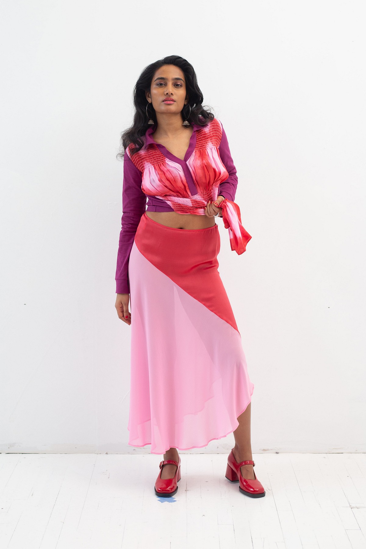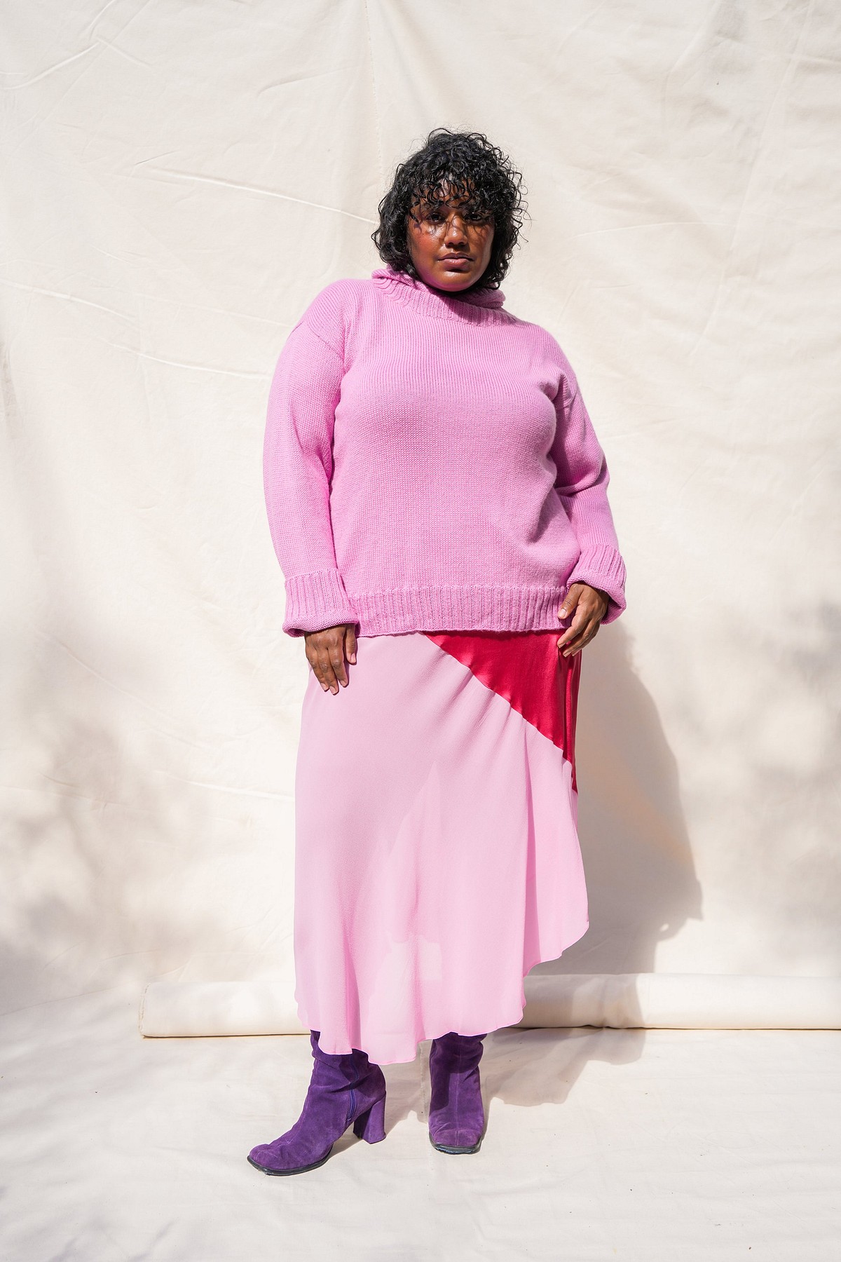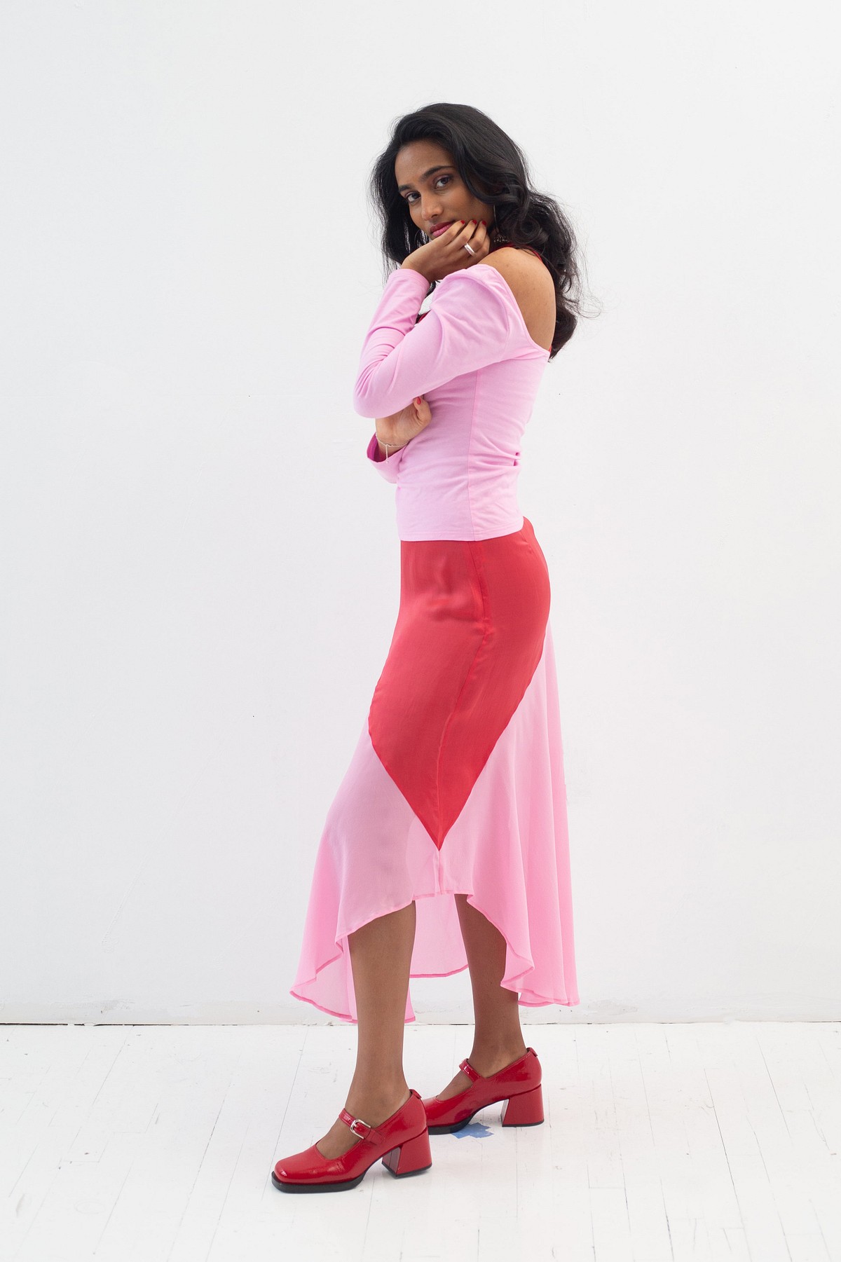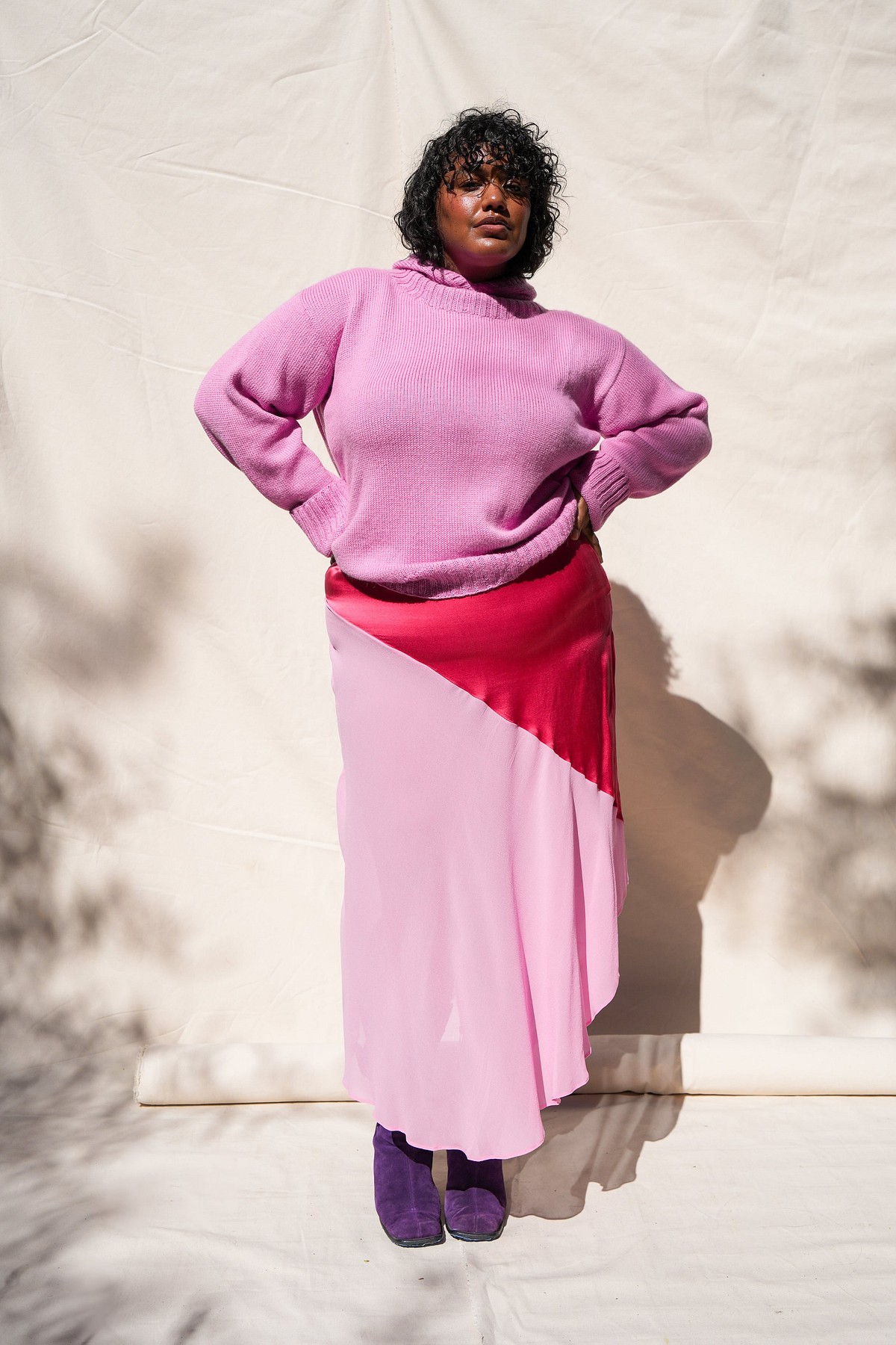 Bias-cut silk slip skirt with a play on colorblocking, texture, and sheerness, with a mix of 100% silk crepe and chiffon. Wear it with our pink baby alpaca Balaclava Pullover.