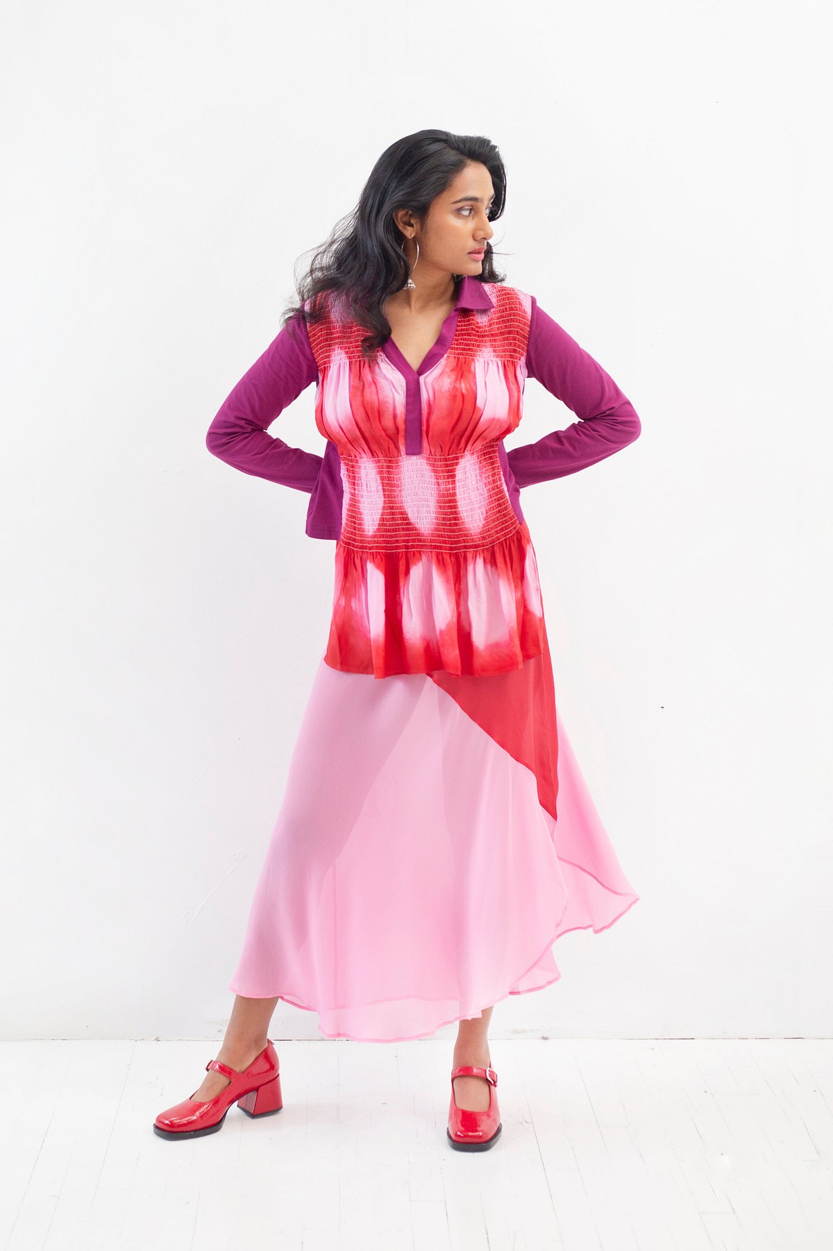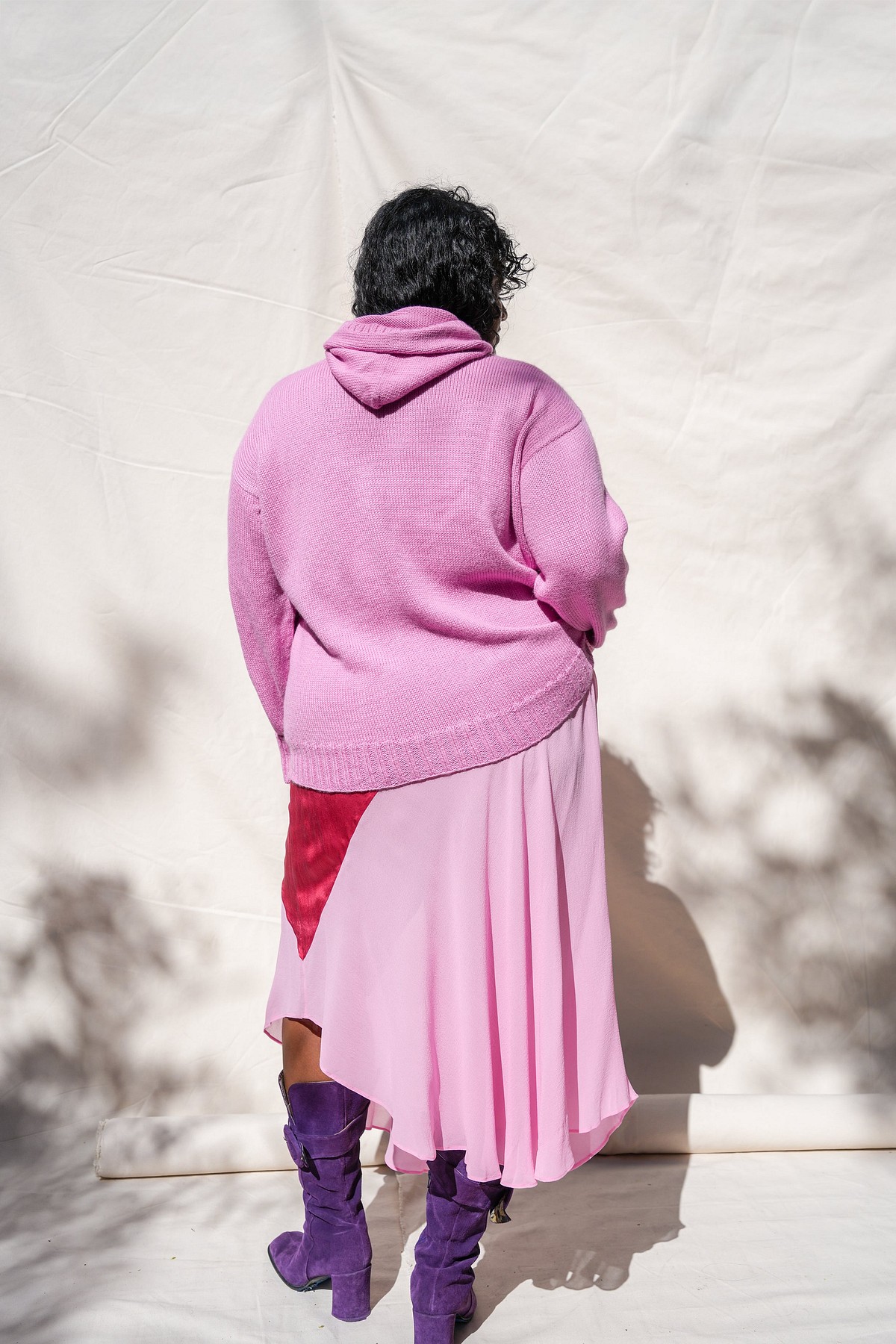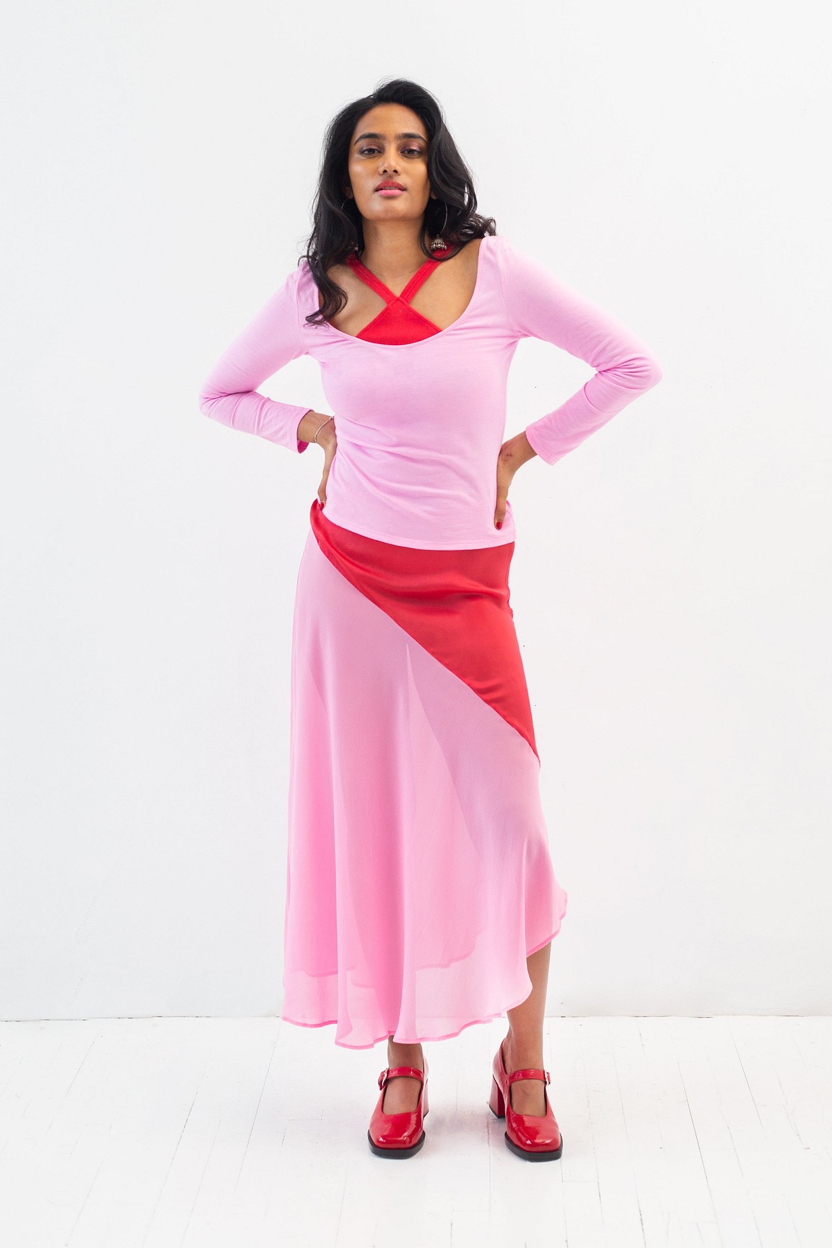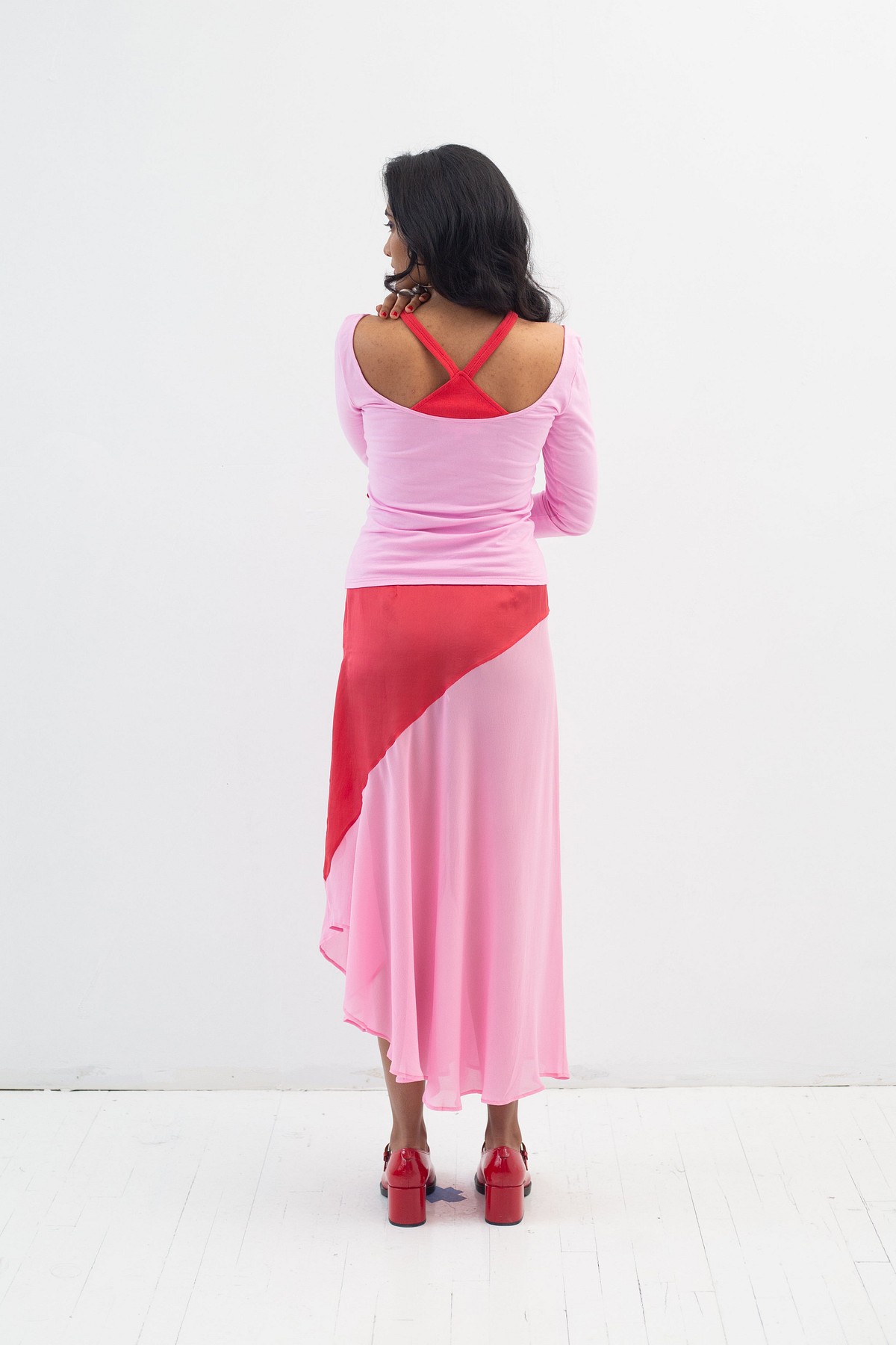 Bias-cut silk slip skirt with a play on colorblocking, texture, and sheerness, with a mix of 100% silk crepe and chiffon. Wear it with our pink baby alpaca Balaclava Pullover.